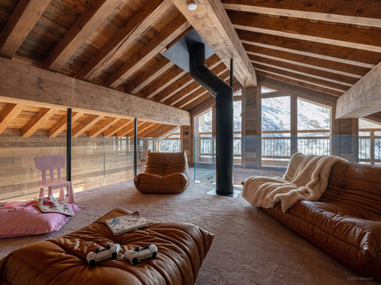 Nel cuore dello chalet, l'ampio soggiorno colpisce per l'arredamento luminoso ed elegante. Aperto sull'esterno attraverso ampie vetrate, è incentrato su un camino aperto centrale, che separa il soggiorno dalla sala da pranzo. Un angolo lettura offre uno spazio più tranquillo, mentre un soppalco offre una sala TV con giochi da tavolo, perfetta per prolungare le serate.