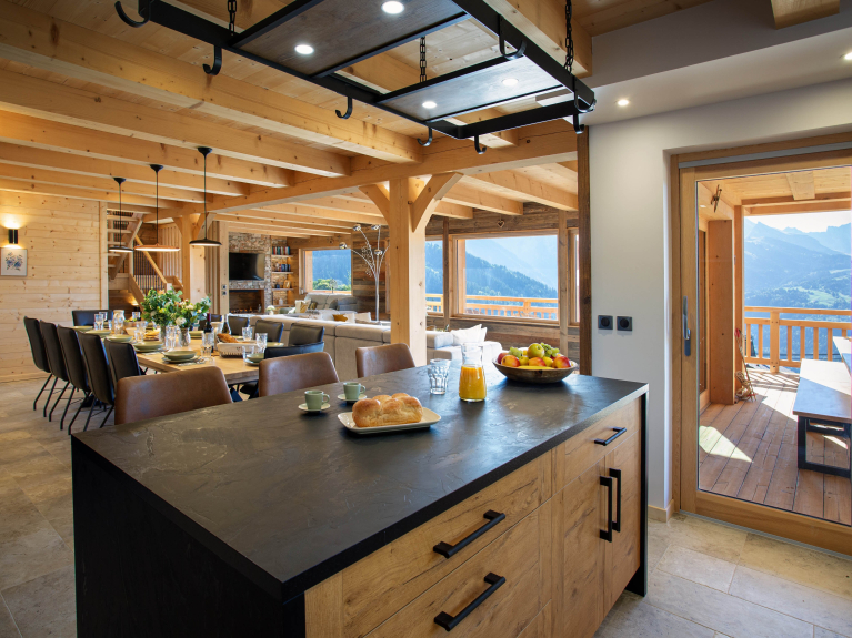 Ampio soggiorno con vista sulle montagne, sala TV separata, sala da pranzo per 14 persone, cucina completamente attrezzata (2 frigoriferi, 2 forni, congelatore, lavastoviglie, lavatrice e asciugatrice).