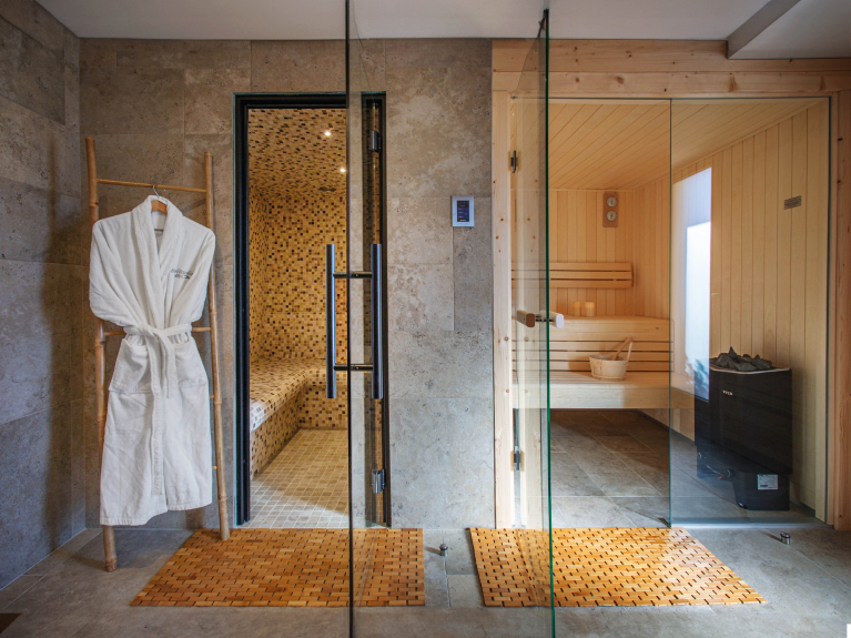 Area benessere privata al piano terra: hammam, jacuzzi e sauna.