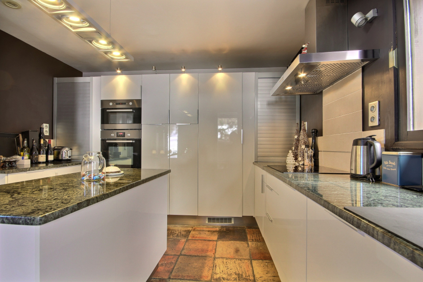 - cucina completamente attrezzata che si apre sulla terrazza: piano cottura in vetroceramica, forno, grande frigorifero, lavastoviglie, cappa d'aspirazione
