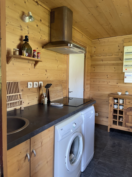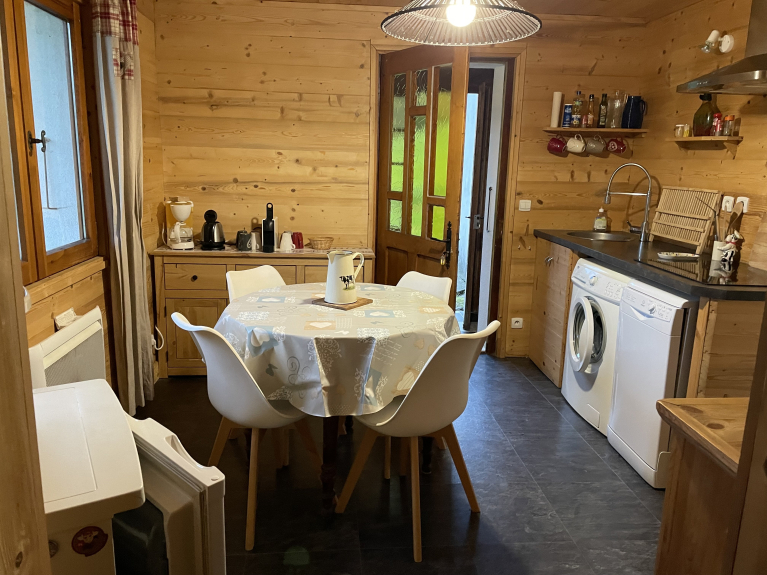 Dispone di una cucina completamente attrezzata con piano cottura a induzione, frigorifero, mini forno, microonde, lavastoviglie, lavatrice, macchina da caffè con filtro, macchina da caffè Nespresso, bollitore elettrico, tostapane e macchina per raclette.
