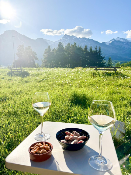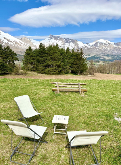 Per gli amanti della montagna in estate, c'è un'area esterna molto piacevole con vista sulle montagne, sedie a sdraio e un tavolo di legno sulla terrazza.