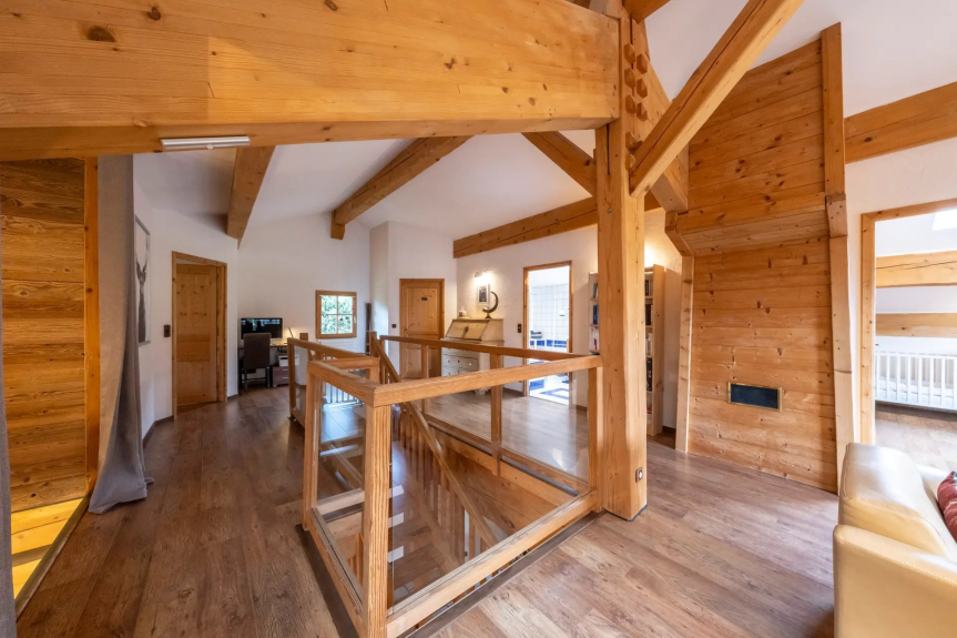 Una scala in legno conduce al primo piano, dove si trovano una piccola zona ufficio con stampante e una zona relax con pavimento in vetro.