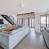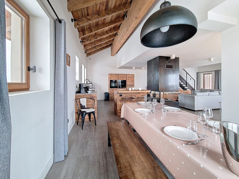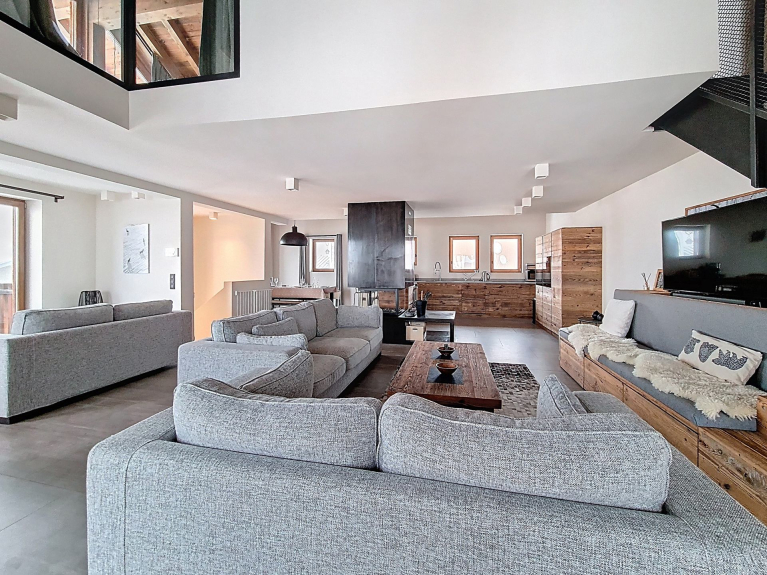 Soggiorno a pianta aperta e cucina completamente attrezzata. L'accesso a due balconi offre una vista ininterrotta sulle montagne.