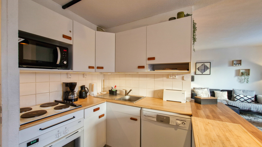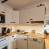 - Zona cucina con piano cottura elettrico, forno, microonde, lavastoviglie e frigorifero