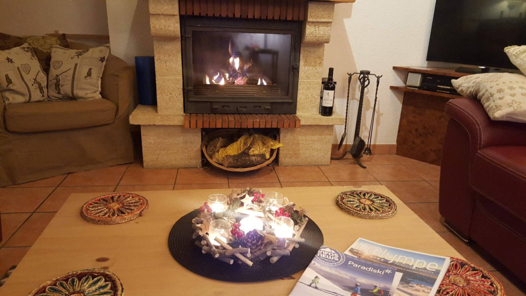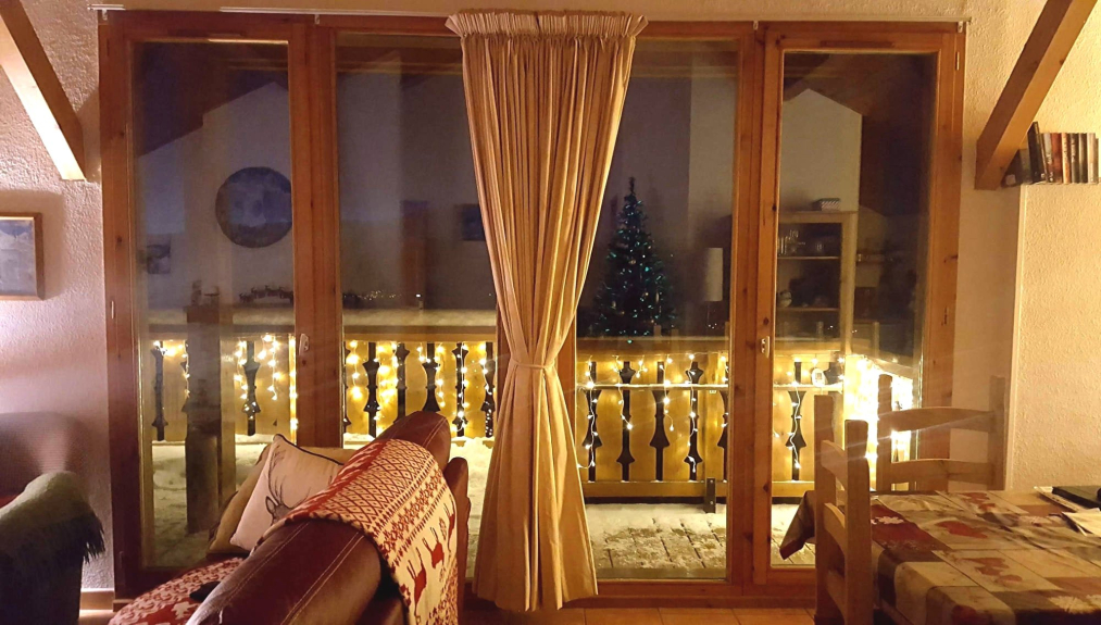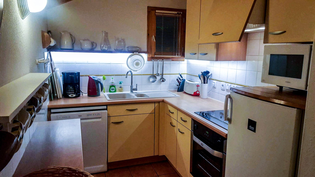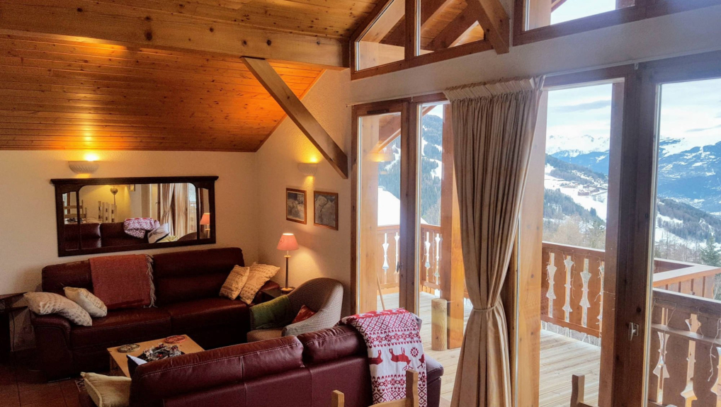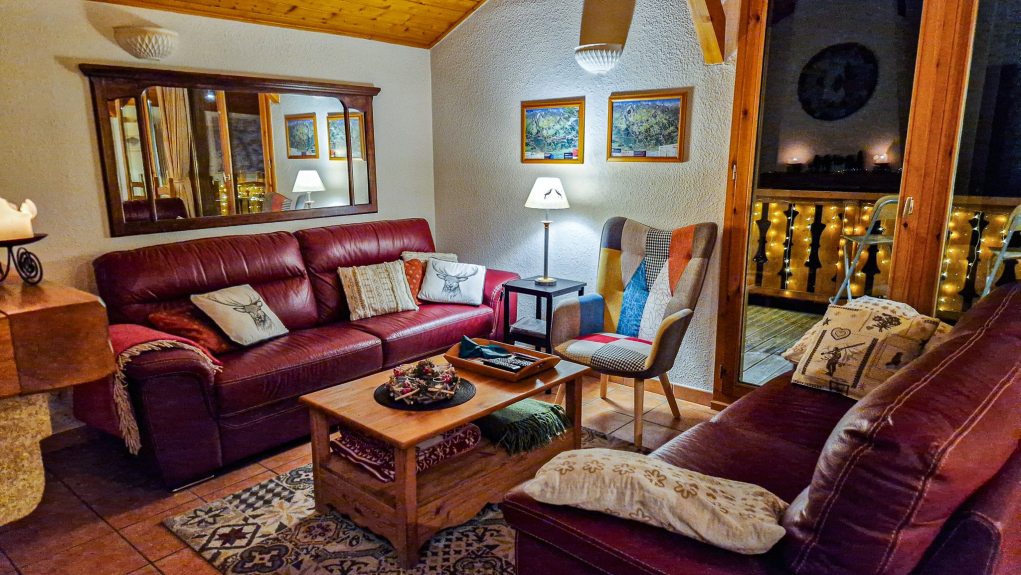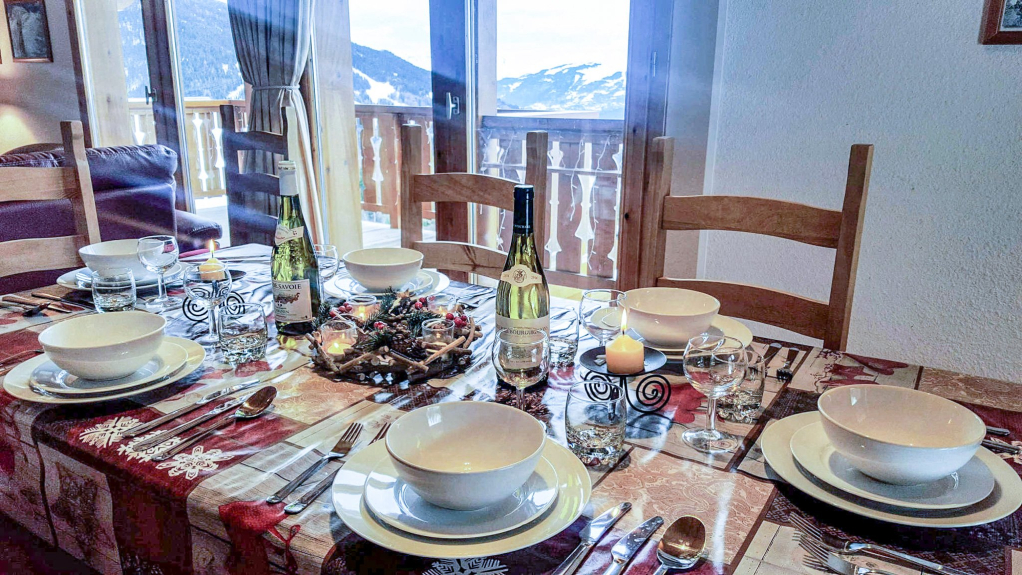 L'ampio salone dispone di due divani, un camino a legna, una televisione internazionale francese e britannica e un lettore DVD. La cucina completamente attrezzata è dotata di forno moderno, piano cottura a induzione, grande frigorifero e macchina da caffè a filtro e a cialde. È quindi perfettamente attrezzata per il self-catering, ma è anche possibile organizzare un servizio di catering. L'ampio balcone offre una vista spettacolare sulla valle dell'Isère e sul Monte Bianco. È il luogo ideale per ammirare il tramonto con un bicchiere di vino.