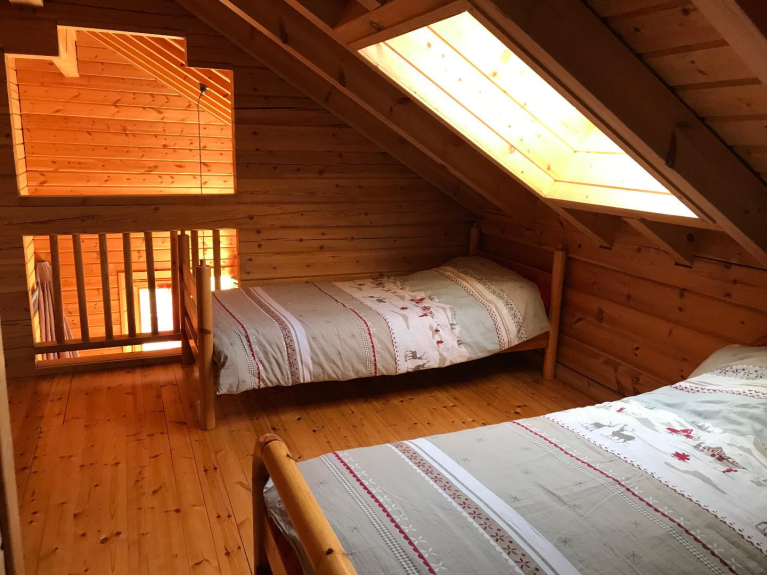 -- Una camera con due letti singoli, una camera con letto matrimoniale e culla, un divano letto nella stanza principale. Sul mezzanino: una camera doppia e una camera matrimoniale (possibilità di aggiungere un materasso matrimoniale, fornito). Tutte le camere da letto hanno armadi per lo stoccaggio. Tutti i letti hanno cuscini/coperte e sono protetti da lenzuola. Potete portare le vostre lenzuola o piumoni.