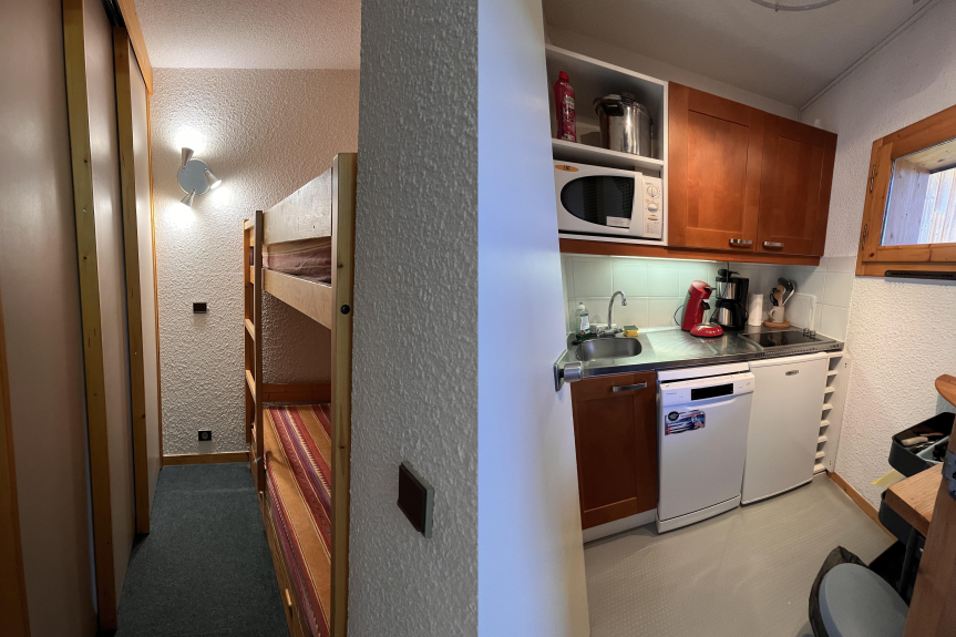 Résidence Améthyste "sci ai piedi" Appartamento GENTIANE: vi troverete in un appartamento di 22 m², al 2° piano con ascensore, attrezzato per 4 persone, con tutti i comfort moderni, cucina completamente attrezzata e indipendente, soggiorno divisibile: letto a pettine e zona montagna (chiudibile) con 2 letti a castello. Armadietto per gli sci riscaldato e sicuro. Accesso diretto alle piste.