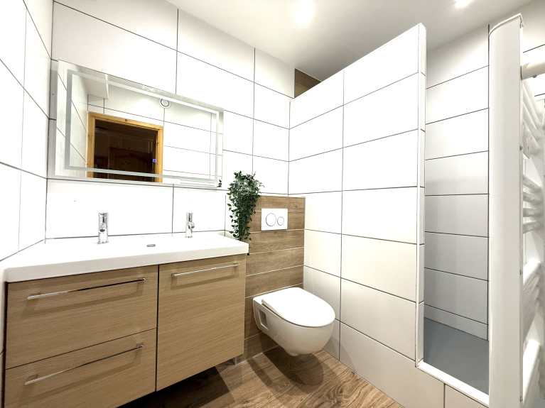Alloggio di ottima qualità in una residenza situata a 100 m dalle piste, su una collina soleggiata. Bella zona giorno, grande balcone. Area esterna con altalena, tavolo da ping pong e barbecue in estate.
