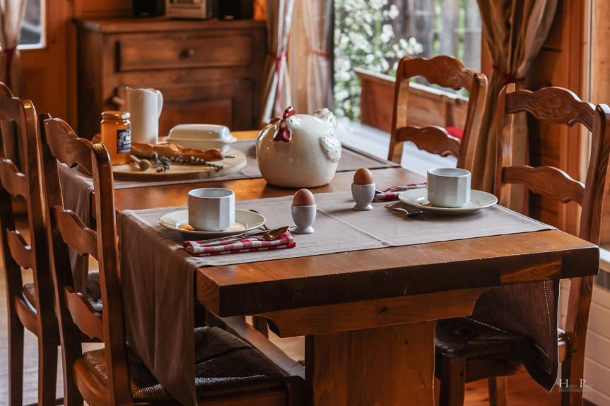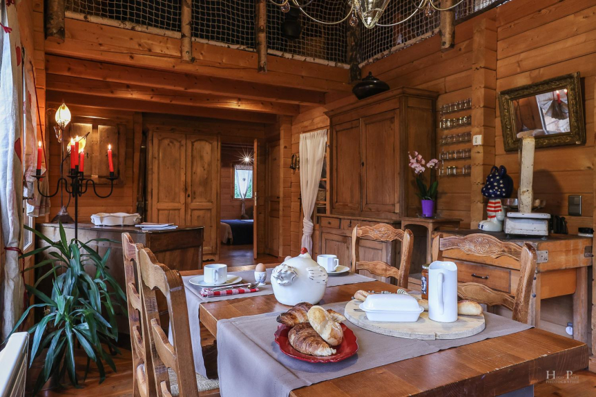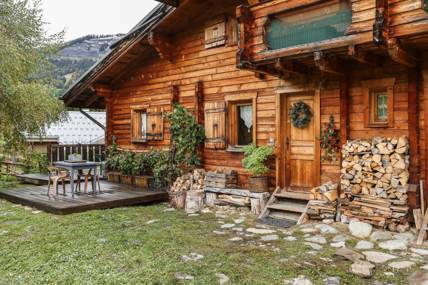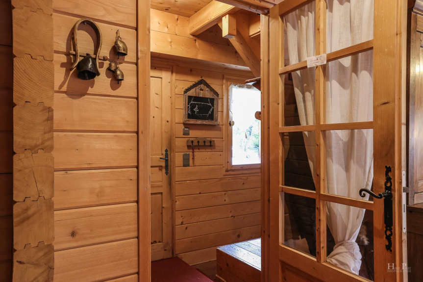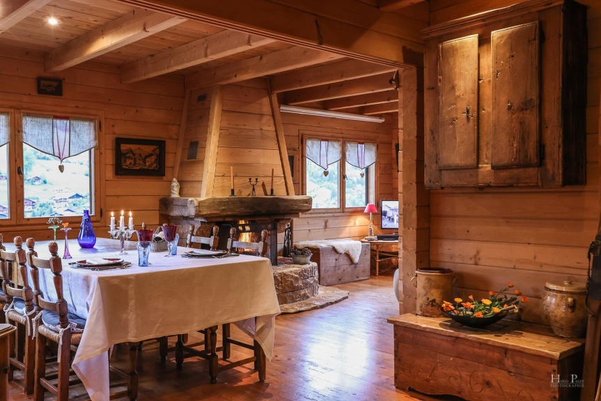 Grande terrazza di legno. Decorazione accogliente e raffinata nel più puro stile savoiardo con mobili antichi.