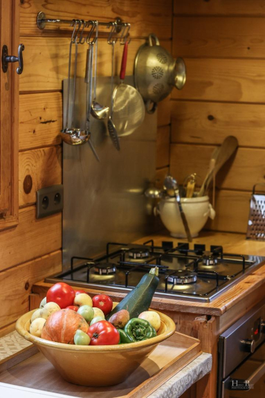 Soggiorno/cucina/lounge con grande camino in pietra e legno. Una camera da letto indipendente con doccia, WC e lavabo al piano terra. Una toilette indipendente al piano terra.