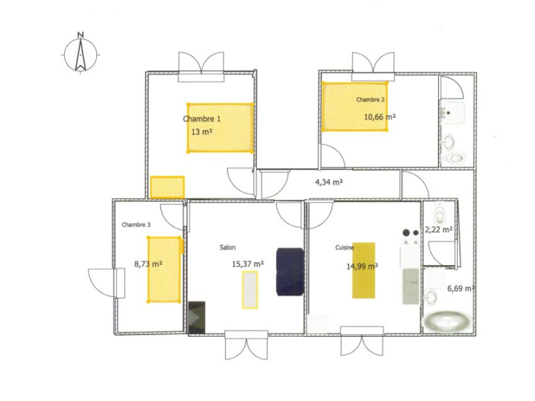 Cucina di 12 m2 separata dal soggiorno di 15 m2. 3 camere da letto indipendenti e 2 bagni.