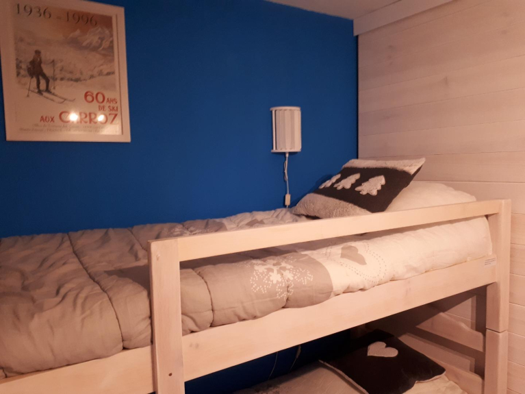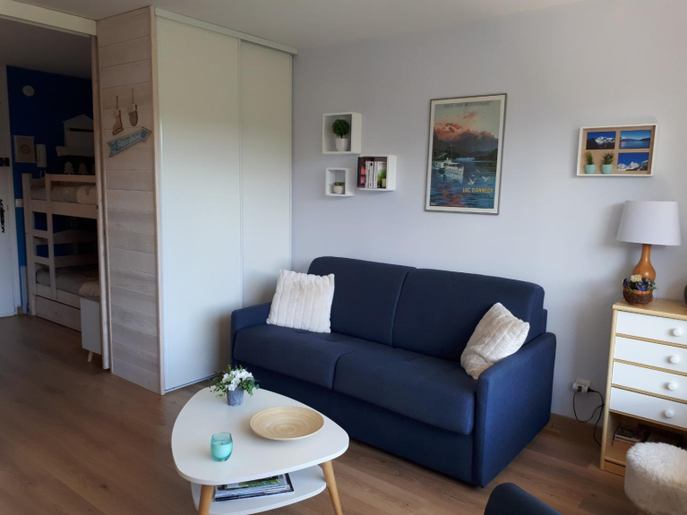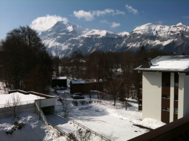 Ampio e luminoso monolocale in una residenza tranquilla, a 200 m dal centro a piedi, vicino a negozi, cinema e pista di pattinaggio, esposto a sud, grande balcone con vista sulle montagne, garage chiuso, armadietto per gli sci,