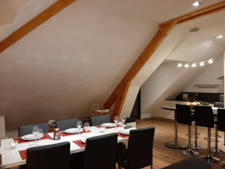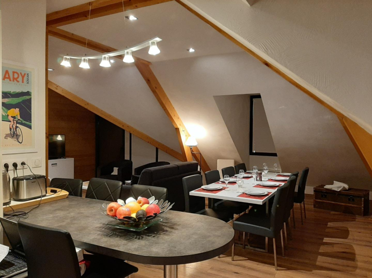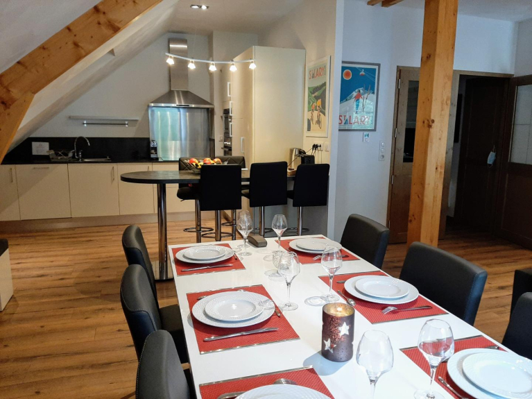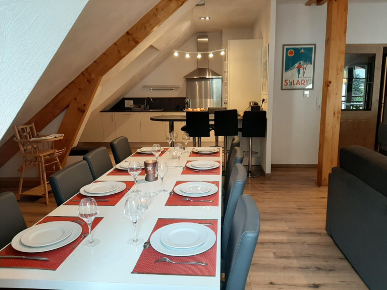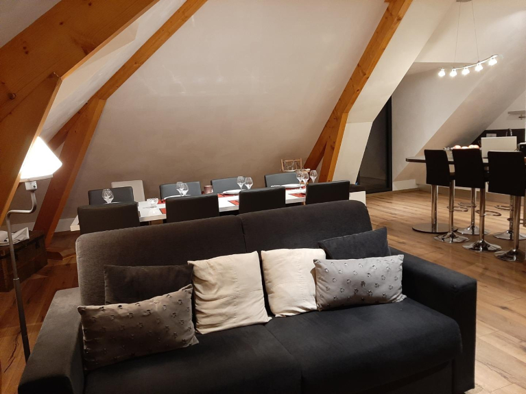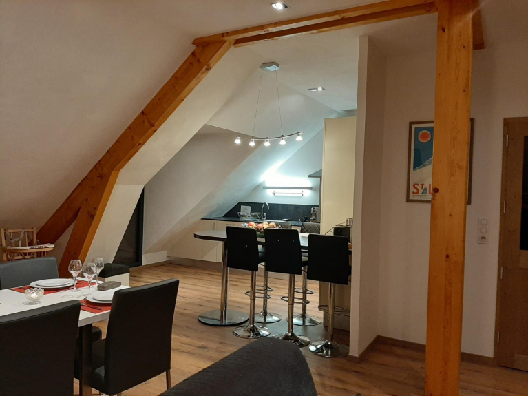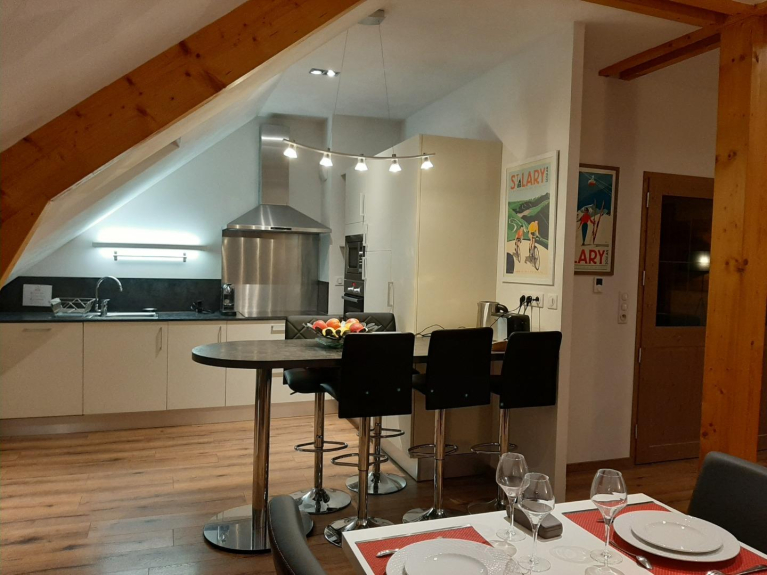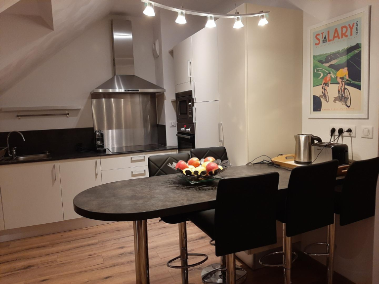 Cuisine entièrement équipée, plan bar, lave vaisselle, plaques induction, four, micro ondes, réfrigérateur, congélateur, cafetière classique + cafetière Nespresso
