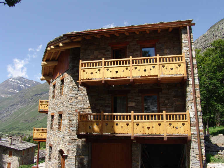 Le chalet sur 2 niveaux est typique du village classé, fait de pierre, de bois et de lauzes.
