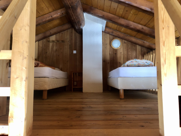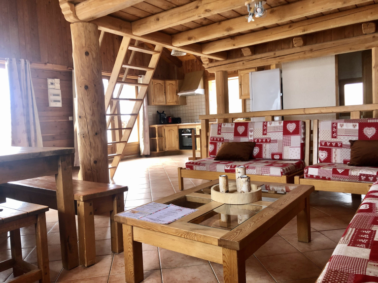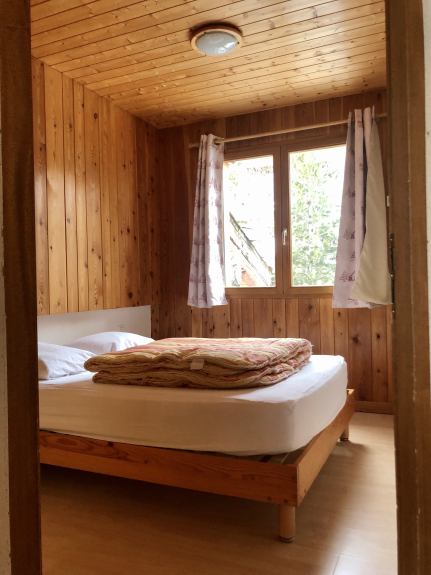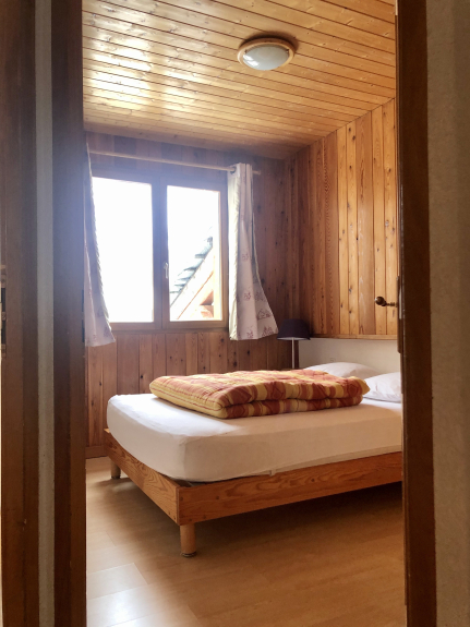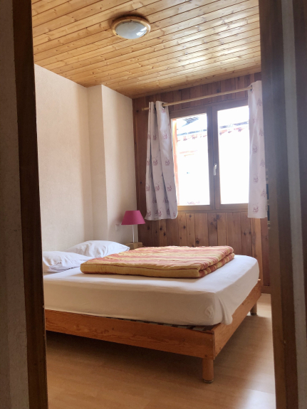 Appartement pour 12 personnes dans un Chalet situé au pied des pistes. L'appartement est sur deux étages, les chambres au premier étage avec une salle de bain (baignoire) et des toilettes. 3 chambres avec un lit double, une chambre avec 2x2 lits superposés. A l'étage : le salon, la cuisine, une salle de bain (douche) et des toilettes. Un balcon / terrasse permet de profiter du soleil face aux pistes. Mezzanine au-dessus du salon avec deux lits simples.