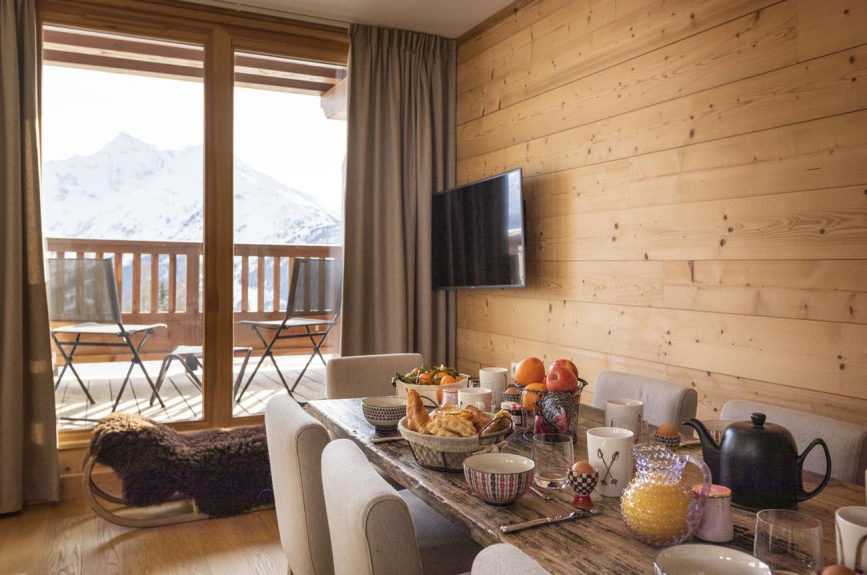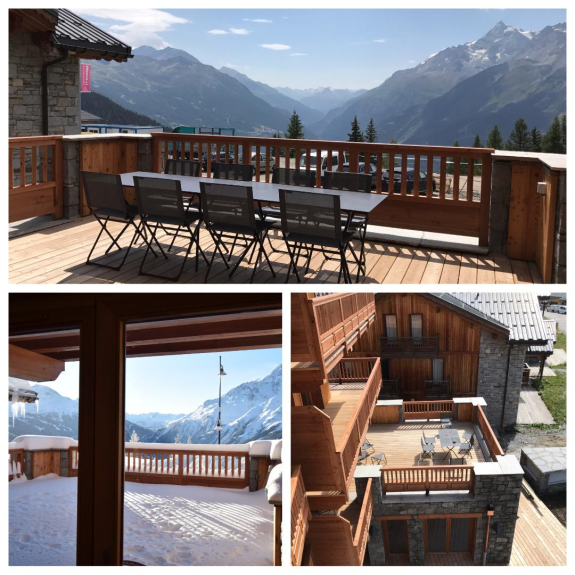 L'appartement de +/- 110 m² offre une grande terrasse en L de plus de 35m² orientée plein Sud avec une vue panoramique sur la Tarentaise.