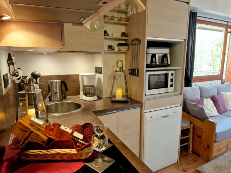- 1 cuisine fonctionnelle et complète équipée d'une plaque à induction , 1 lave vaisselle, 1 grand réfrigérateur avec congélateur, 1 four micro-ondes Grill, 1 four friteuse Airfryer, 1 Cafetiere, 1 batterie de cuisine complète, 1 bouilloire, 1 grille pain et 1 appareil à raclette puissant.