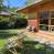 A l’extérieur : salon de jardin en bois, parasol, chaises pliantes, barbecue.