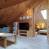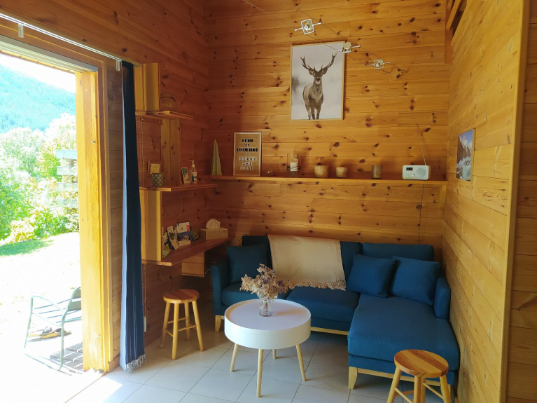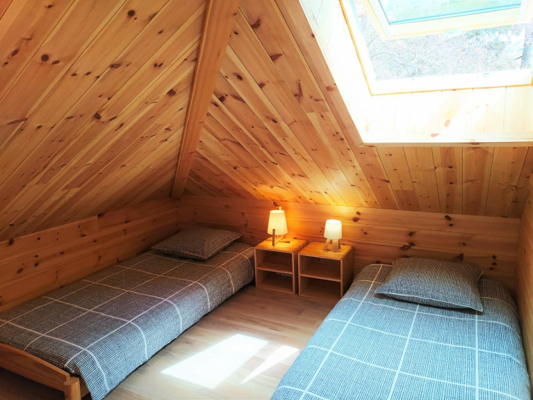 Un escalier de meunier mène à l’étage composé d’une mezzanine ouverte aménagée en salon TV et canapés pour vos soirées en famille ou entre amis, et d’une chambre avec deux lits simples (90x190).