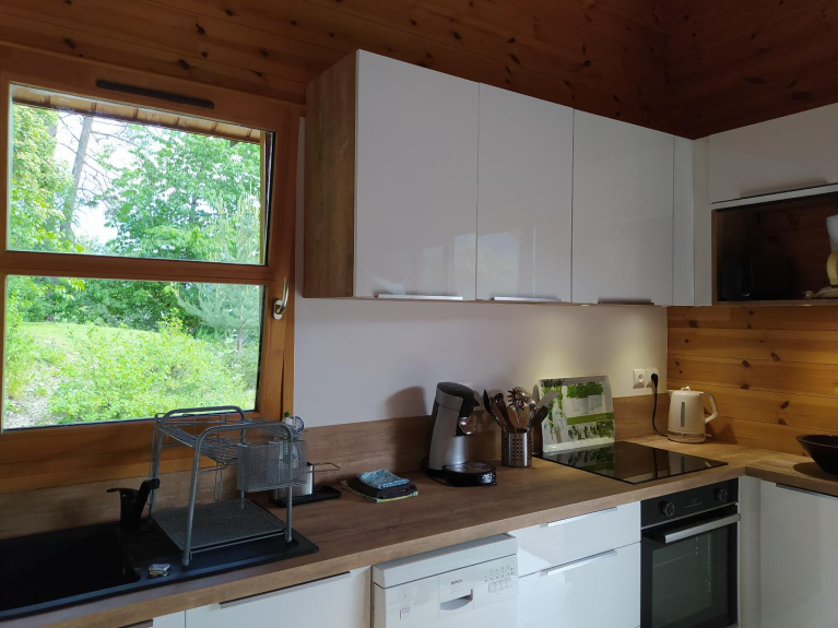 Côté équipements : wifi, lave-vaisselle, four, frigo avec congélateur, plaque à induction, bouilloire, cafetières (filtre et Senséo), appareil à raclette/pierrade et à fondue, lave-linge, étendoir, fer à repasser.
