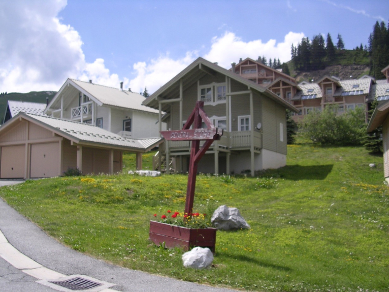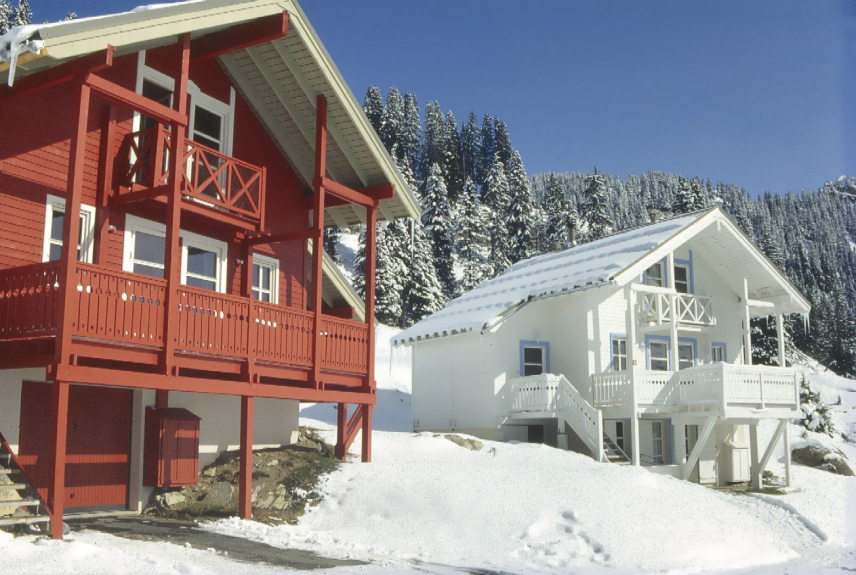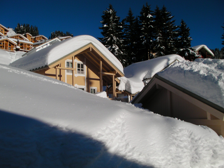 Magnifique quartier de chalets scandinaves avec quelques commerces situé au Hameau de Flaine. Piste bleue à proximité pour atteindre les remontées mécaniques et skibus gratuit pour accéder au départ des pistes et rassemblement d'écoles de ski de Flaine Forêt.