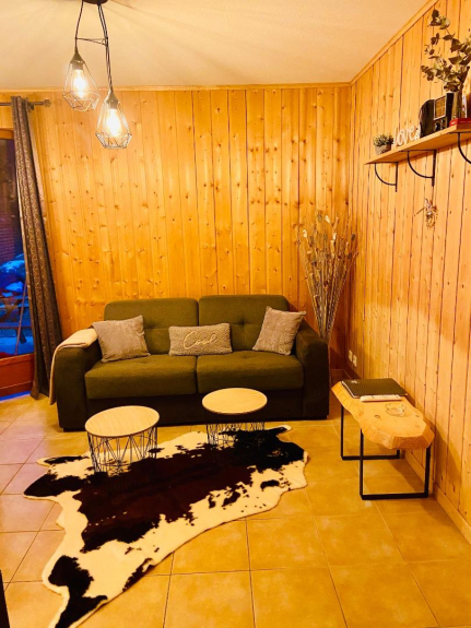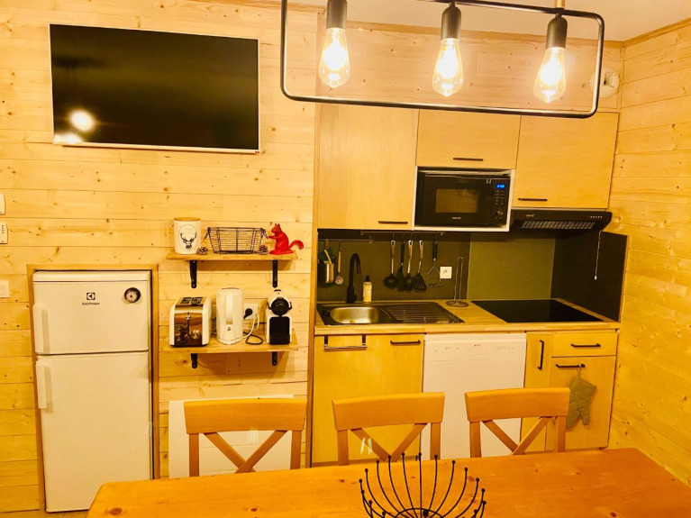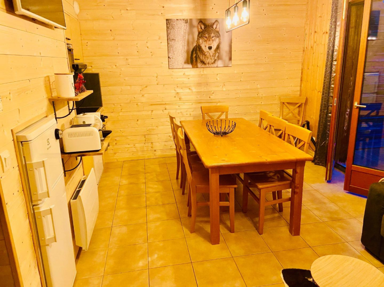 Le chalet en lui-même se compose d'un rez-de-chaussée: cuisine équipée, plaque induction, micro-onde avec fonction HOTBLAST pour cuire pizza, poulet, gâteaux ou frites, frigo avec congélateur, appareil à raclette, Nespresso.