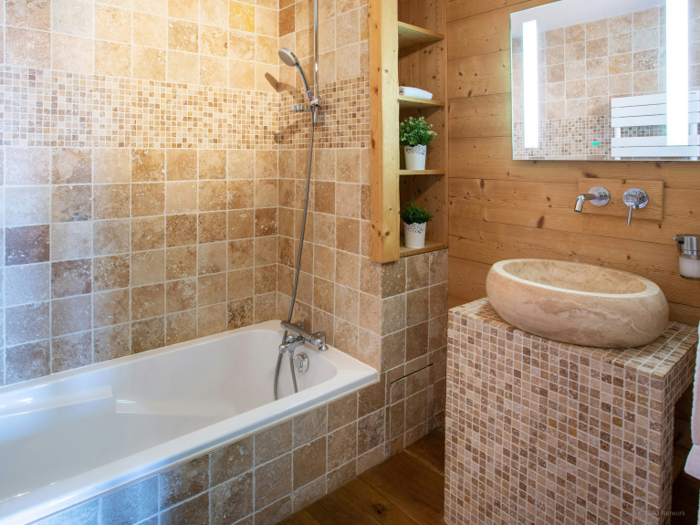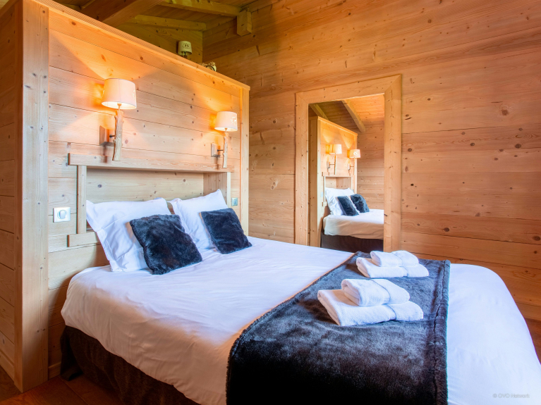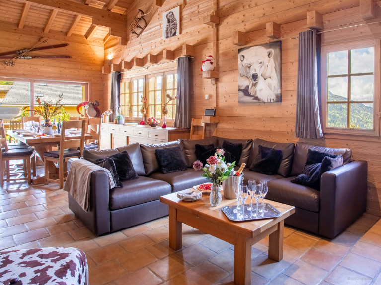 L’intérieur du chalet a lui aussi été pensé pour votre confort : système de sonorisation Bose, canapés modulables dans les deux salons et coin cheminée afin d’accommoder au mieux votre groupe.