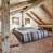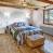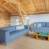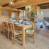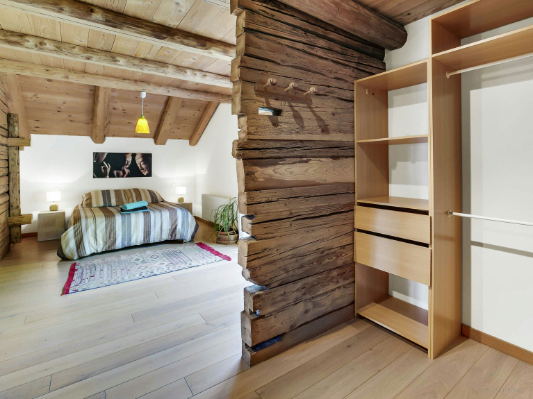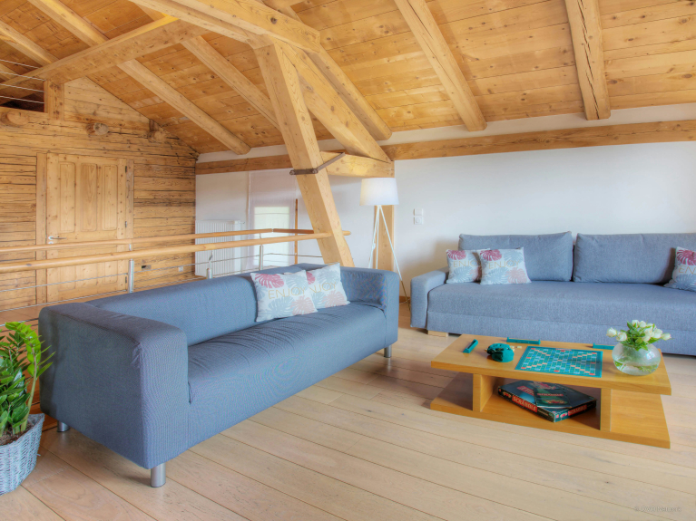 Un salon ‘traditionnel’ se trouve à l’étage, qui consiste en une grande pièce entièrement ouverte où se trouvent également une bibliothèque, une salle de jeux, un espace nuit en partie ouvert avec deux lits simples et une chambre double installée en hauteur, sous les combles.