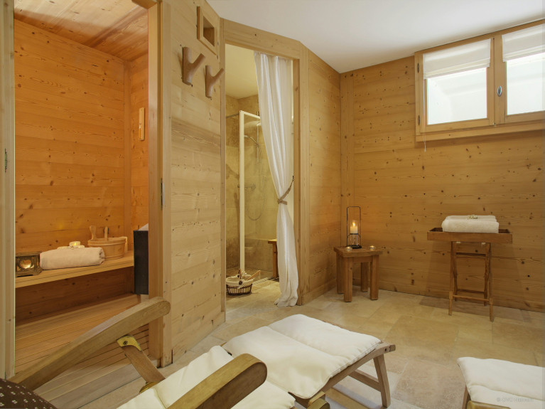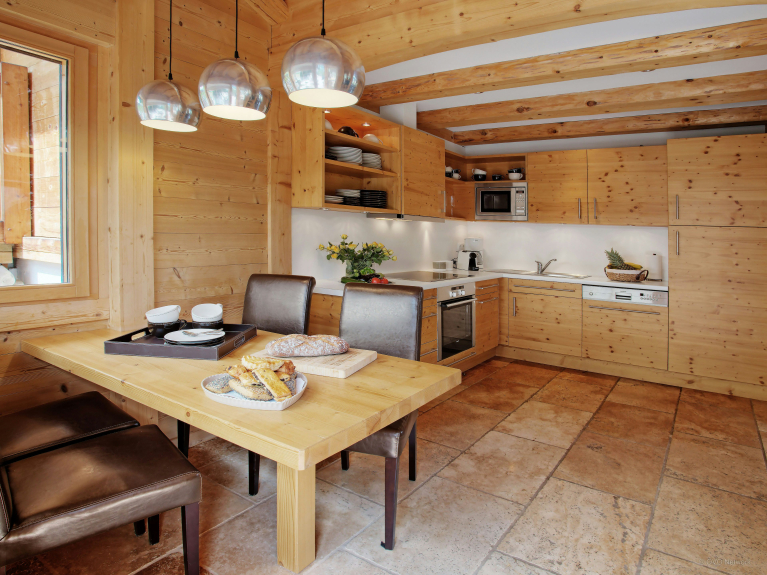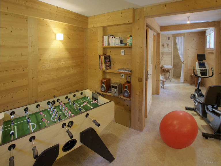 La pièce de vie est très agréable, avec la cuisine ouverte sur une grande table pour partager des repas chaleureux. Pendant que certains bouquinent au calme près de la cheminée, d'autres peuvent profiter du sauna à l'étage inférieur. Les plus sportifs peuvent entretenir leur forme sur le tapis de course et les plus joueurs se défier au babyfoot.