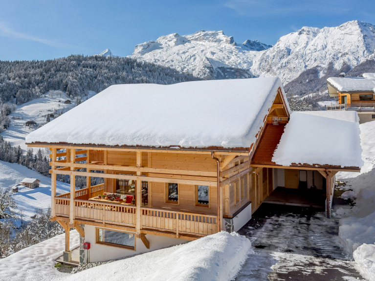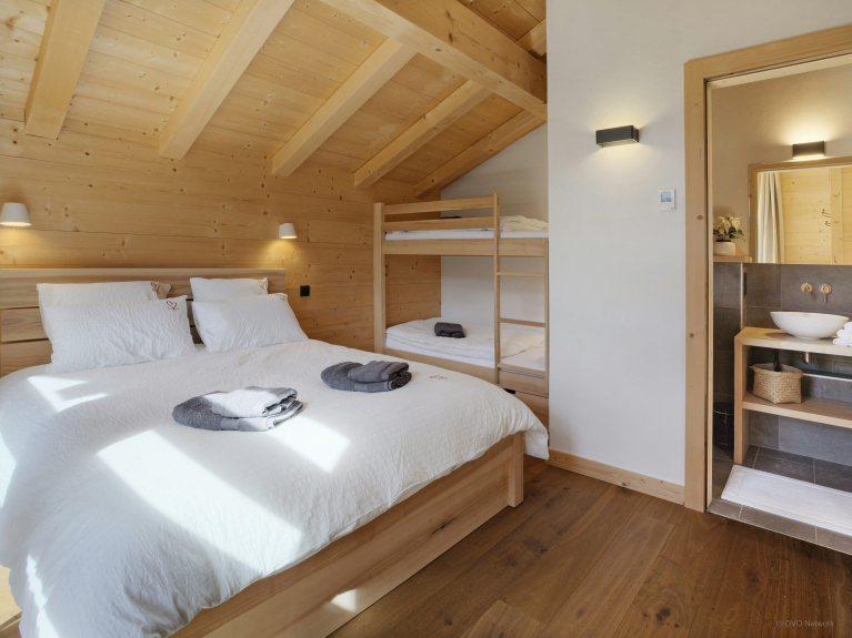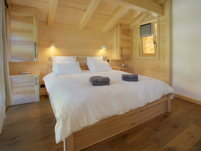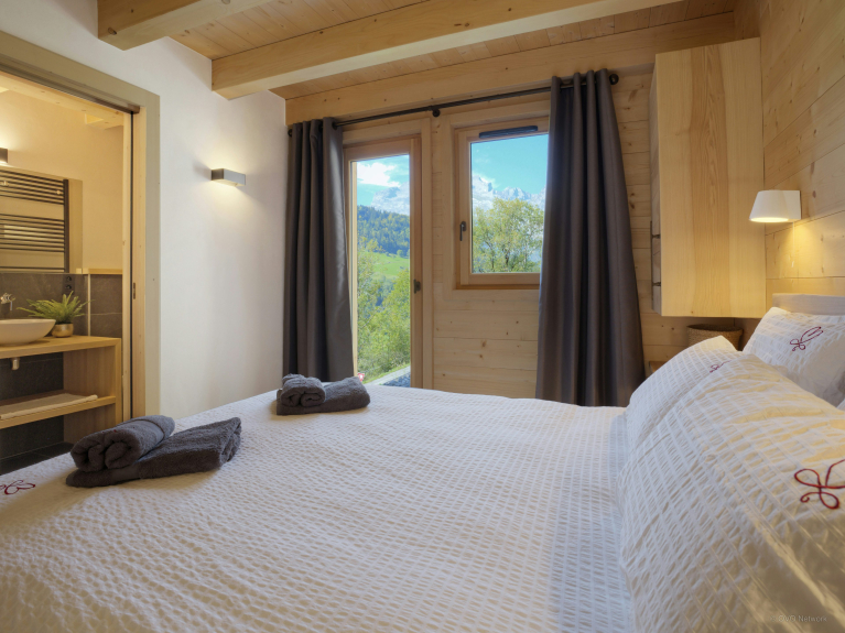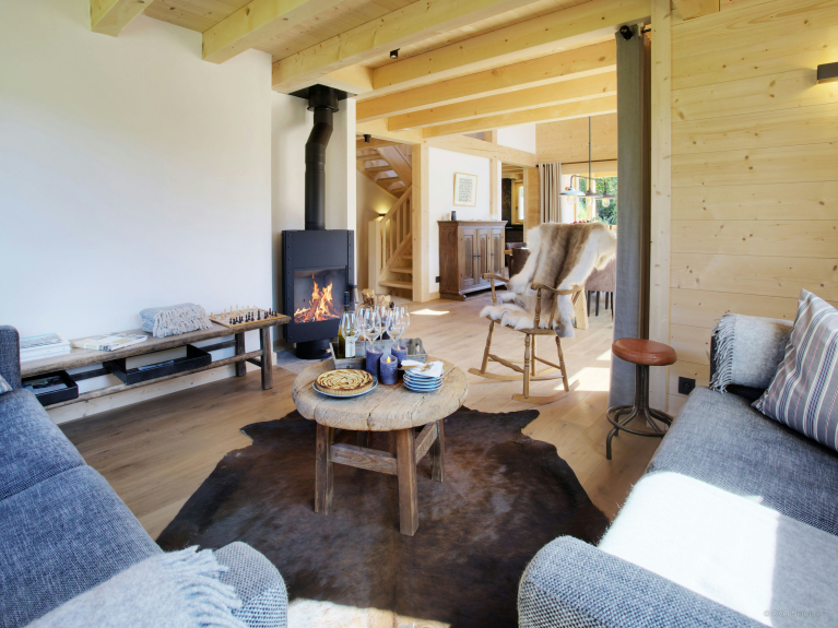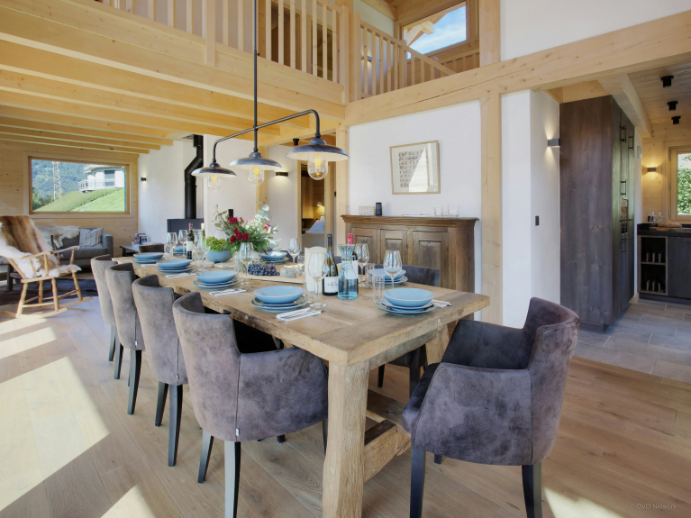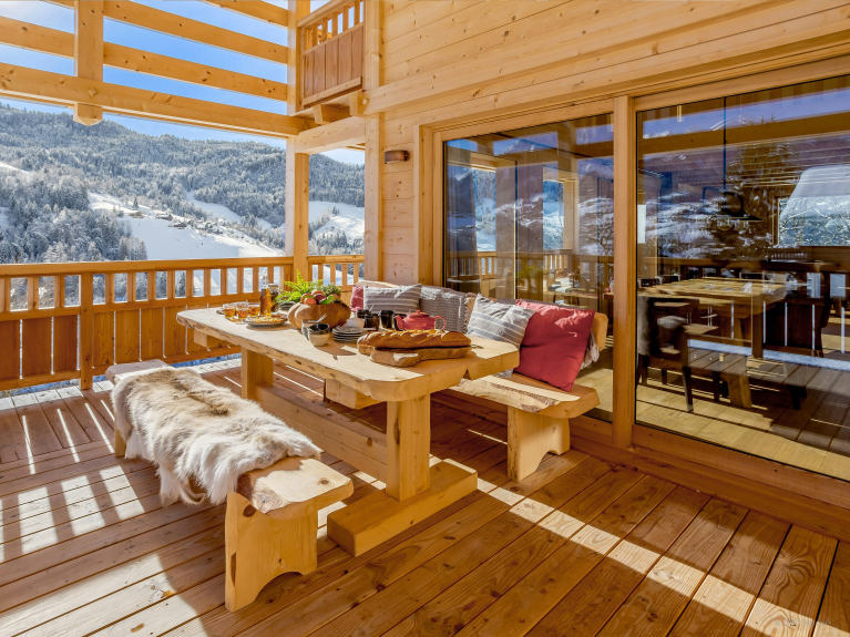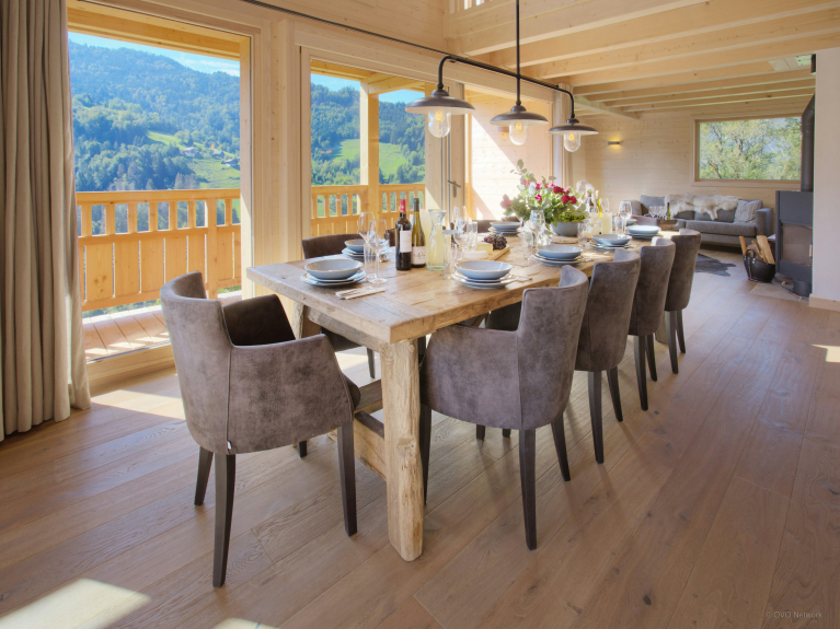 Nous aimons particulièrement le poêle dans la pièce à vivre, car vous pouvez l’orienter vers la table à manger pendant votre dîner par exemple, puis le réorienter ensuite vers le salon où vous vous réunirez en fin de soirée. Les terrasses créées sur les trois côtés du chalet vous permettront de profiter du soleil tout au long de la journée. Mais vous trouverez aussi une grande terrasse à l’ombre si vous préférez profiter des extérieurs tout en vous préservant des rayons du soleil. La table à manger extérieure est idéalement située pour admirer le magnifique panorama pendant vos repas.