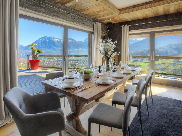 Le chalet Kalyssia possède tous les éléments nécessaires pour passer un séjour parfait dans les Alpes. La salle de jeux et la piscine chauffée (entre mi-mars et mi-novembre) vous permettront de profiter de moments de divertissement, tandis que la cave à vin et le jacuzzi extérieur vous inviteront à la détente, tout en appréciant les splendides vues sur le lac d’Annecy et les montagnes. Des bains de soleil, un barbecue et une plancha sont installés sur la terrasse.