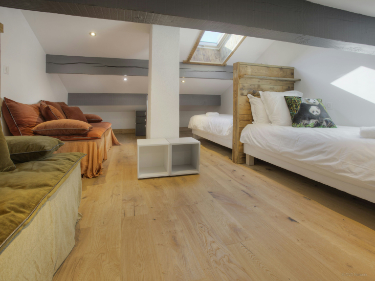 Nous aimons beaucoup la chambre à coucher du rez-de-chaussée qui donne sur la terrasse ensoleillée en façade du chalet. C’est un endroit idyllique pour savourer un dernier verre tout en regardant le soleil se coucher. S’il y fait trop chaud l’été, optez plutôt pour le jardin situé à l’arrière. Les enfants y joueront en sécurité puisqu’il est clôturé. Vous y trouverez aussi une terrasse ombragée et un espace barbecue.