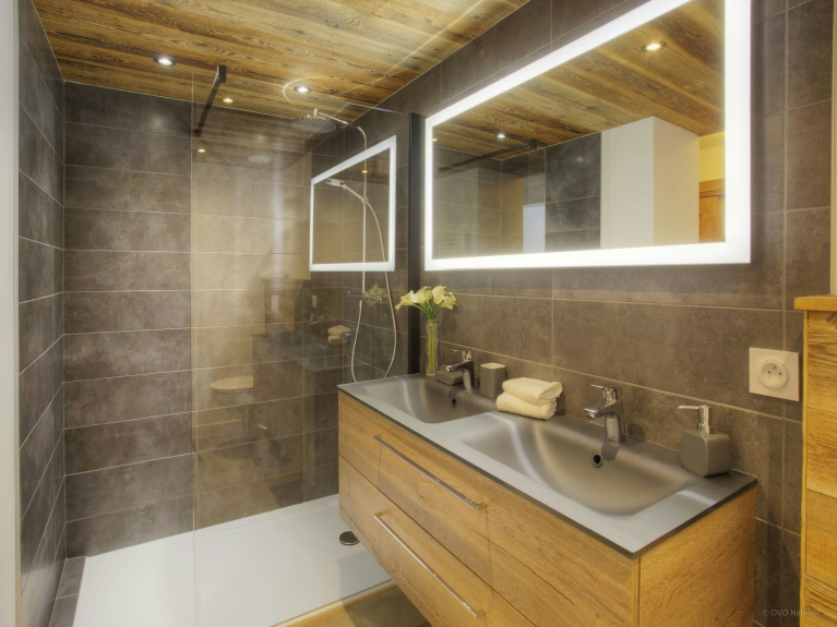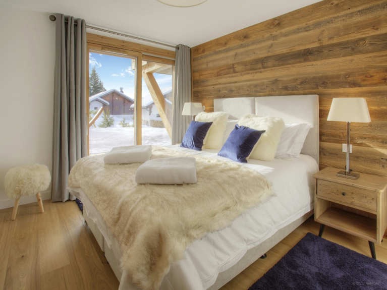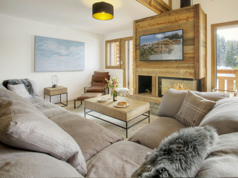 La décoration et le beau mobilier sont en harmonie et créent une ambiance montagnarde chaleureuse et décontractée. La palette de couleurs invite au repos et à la relaxation. Des canapés moelleux et confortables sont disposés autour de la cheminée et de grandes baies vitrées offrent une vue fantastique sur le mont Chéry. Vous aurez envie de passer du temps dans cette pièce agréable.
