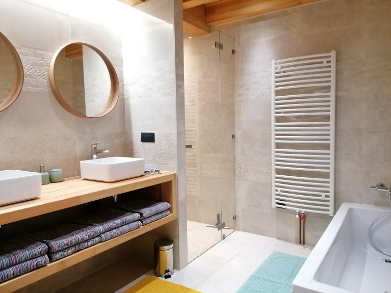 * Salle de bain 1 : 2 vasques, douche italienne et baignoire ;