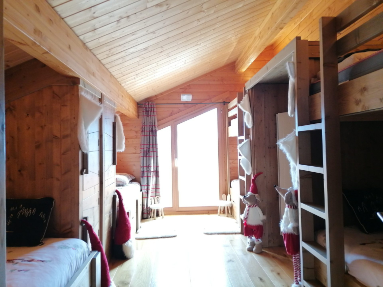 * Chambre 6 (dortoir) : 2 ensembles de lits superposés et 2 lits simples en 90 ;