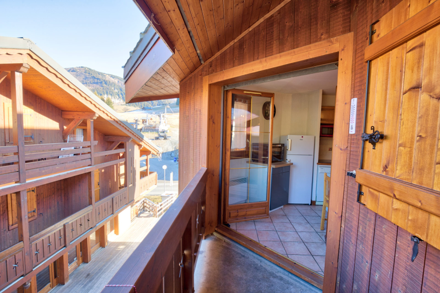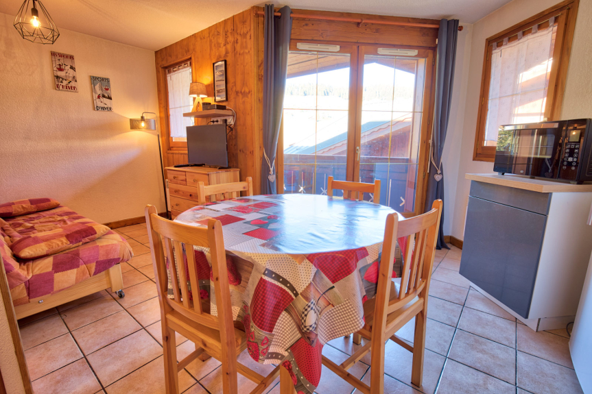Appartement de 23m² pour quatre à cinq personnes, au deuxième étage de la résidence avec balcon EST. La résidence se situe en face du départ des pistes de l'Espace Diamant et de l'ESF.