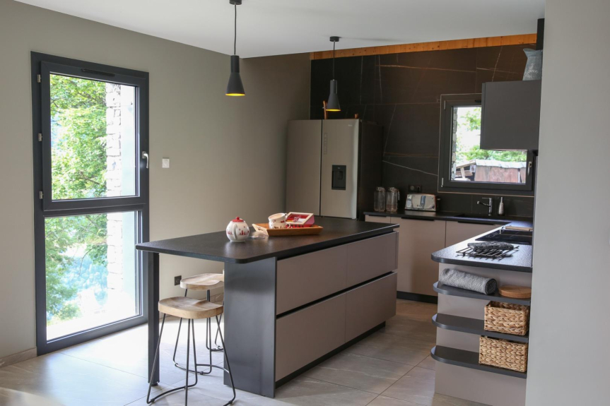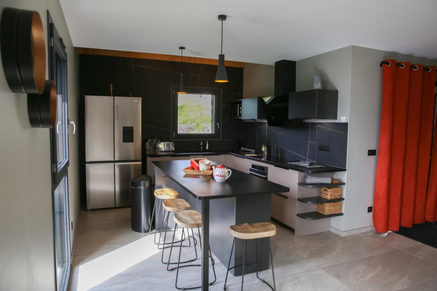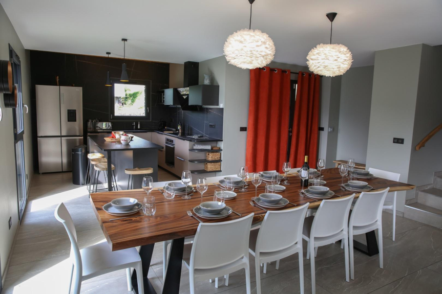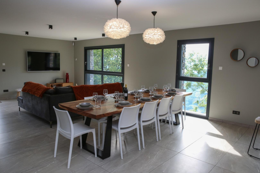 Au premier niveau, découvrez une grande pièces de vie de plus de 60m2 offrant une cuisine semi professionnelle avec au centre un large ilot central (plaque induction, maxi frigo, congel, lave vaisselle, cafetière Nespresso, appareils a fondue et raclette, ...), une très grande table pour 12 personnes et un salon cheminée ainsi qu'une double terrasse.