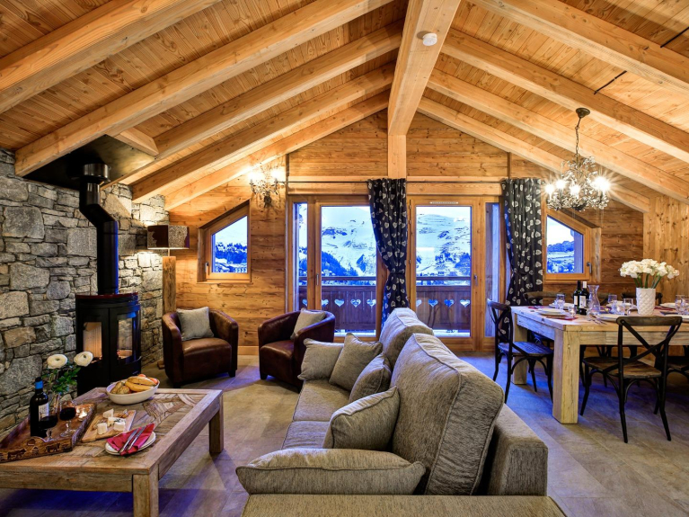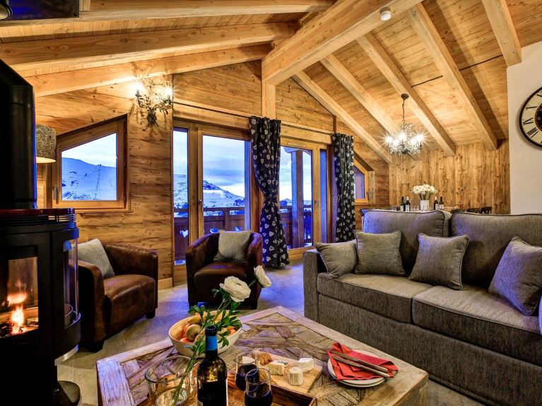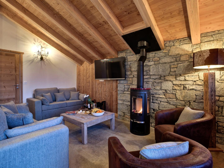 Le salon décloisonné dispose de 2 canapés deux places et de 3 chaises confortables, d'un poêle à combustion, d'une télévision et d'un accès à un balcon offrant une vue imprenable.