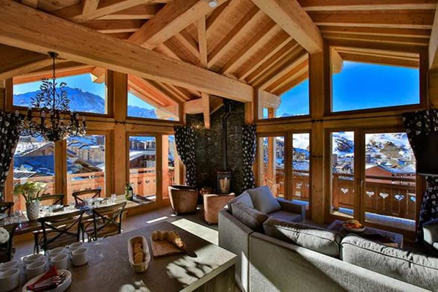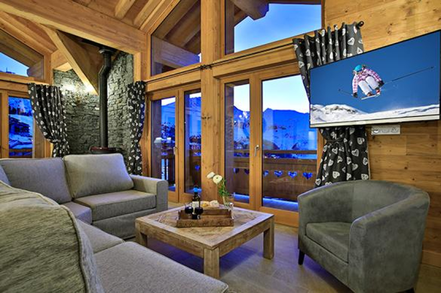 Le salon décloisonné comprend 1 grand canapé en L cinq places et 3 fauteuils confortables, un poêle à bois, une télévision et un accès à un balcon avec une vue imprenable.
