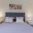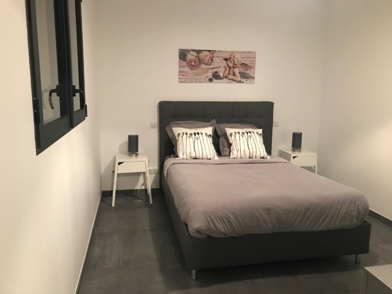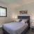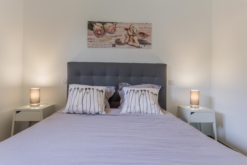 La chambre possède un lit 140 cm avec matelas à mémoire de forme, 2 chevets, un dressing avec tiroirs étagères et cintres.