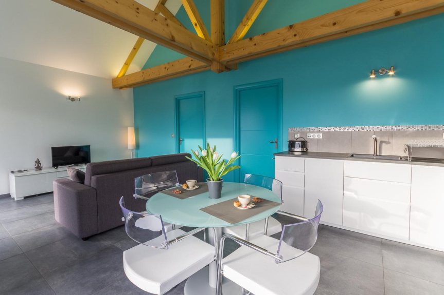 La pièce de vie est très lumineuse, composée d'une cuisine intégrée ouverte sur le salon.
