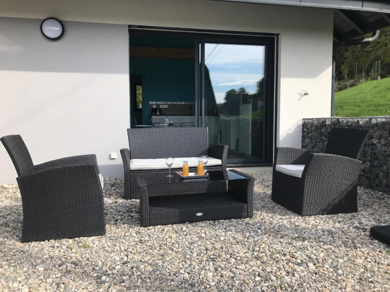 La baie vitrée donne accès à la terrasse privative plein sud munie d'un salon de jardin.
