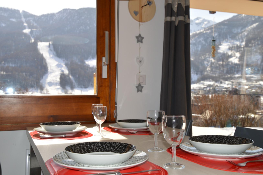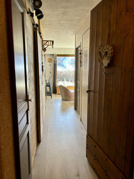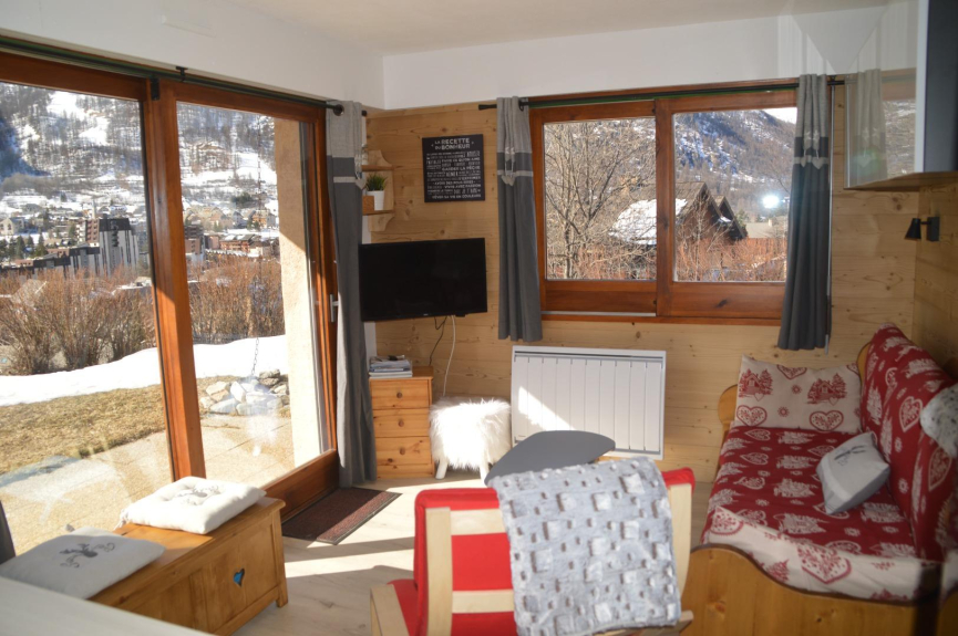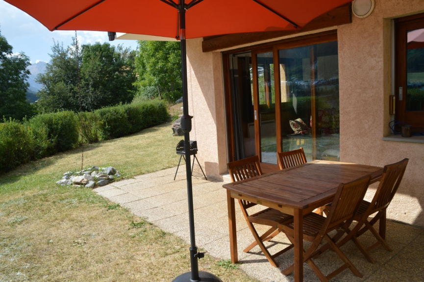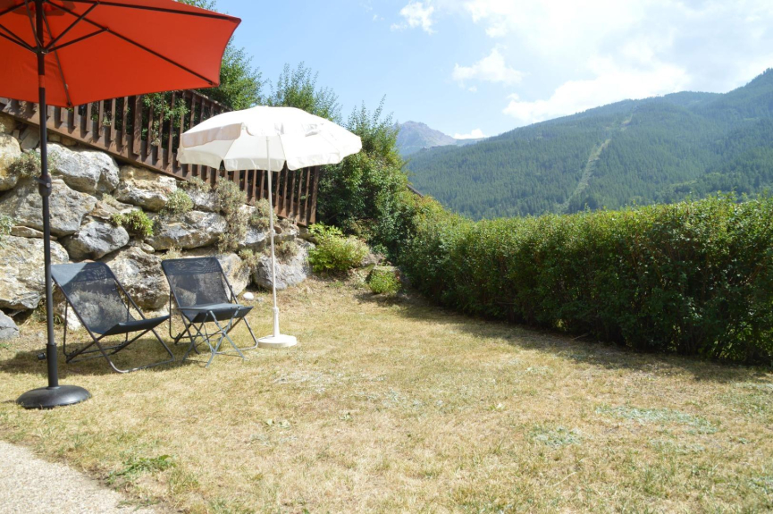 Appart 3* très confortable à l’esprit chalet à Serre Chevalier - Villeneuve 1400, aux portes du Parc National des Ecrins, vue dégagée sur les montagnes, 2 coins chambres, cuisine US super équipée, séjour ouvert sur un jardin clos plein sud sans vis à vis, sèche-chaussures de ski (en hiver), parking, local à skis/snowboard, nombreux rangements.