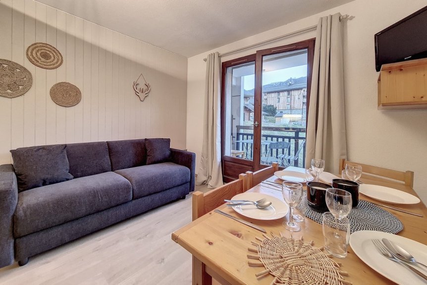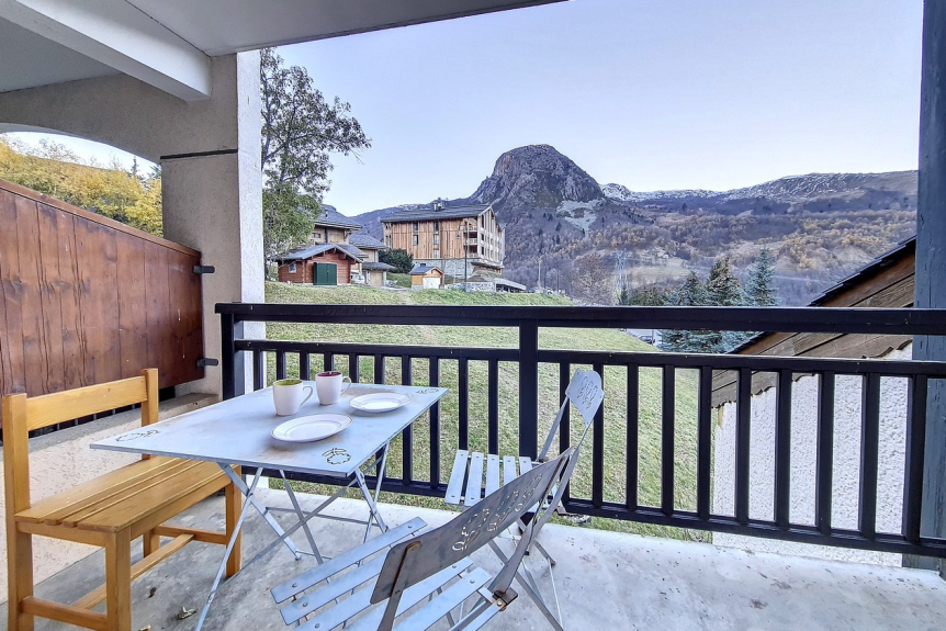 Il possède un large balcon (avec table, transats et lampes rechargeables) exposé sud-ouest offrant une belle vue sur le massif du Cochet.