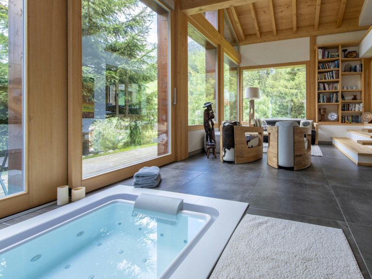 Nous aimons particulièrement la salle de sport, qui comprend un sauna et sa propre salle de douche, et le jacuzzi intérieur surplombant le jardin.