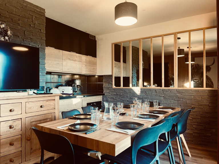 Le chalet offre une cuisine équipée (Nespresso, cafetière classique, four, plaque à induction, grand réfrigérateur et congélateur, micro-ondes, lave-vaisselle, appareils à raclette, à fondue, à crêpes).