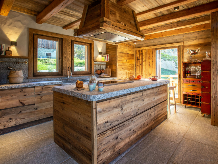 La grande pièce de vie à l’étage central ouvre sur une magnifique terrasse panoramique meublée, où le regard se perd par-dessus la vallée jusqu’au Mont Blanc. La cuisine moderne, quant à elle, comprend une grande cuisinière, deux frigos et deux lave-vaisselle, pour que cuisiner soit toujours un plaisir, même pour les grands groupes. Il y a assez d’espace pour manger tous ensemble à la grande table à manger, ou alors sur la terrasse pour profiter du bon air alpin.
