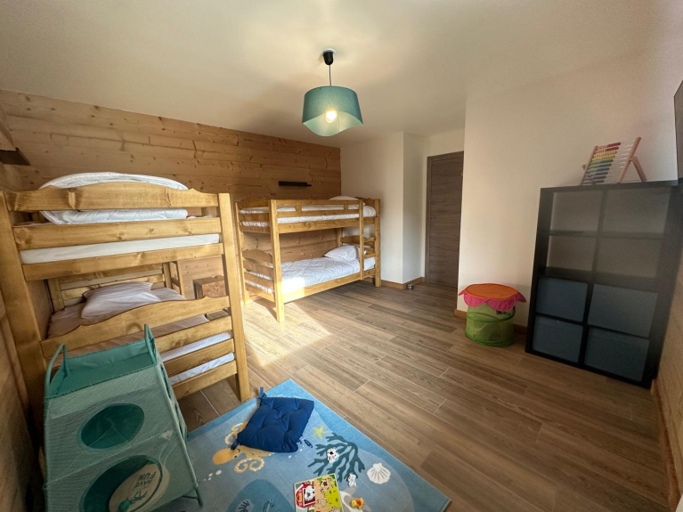 - 1 chambre dortoir avec 4 lits simples superposés (90/190) + TV + coin-jeu + baby-foot