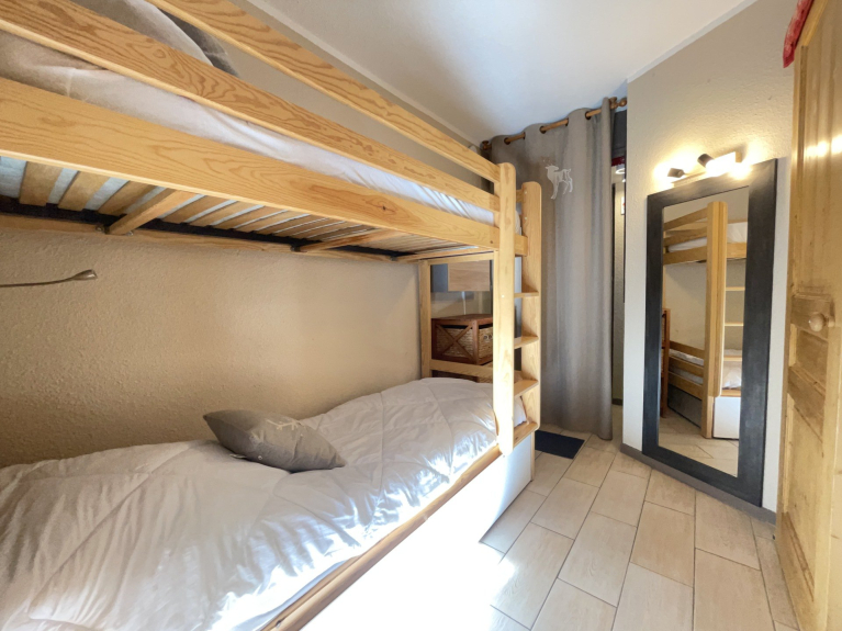 - Couchage : coin montagne avec lits superposés une place (2x70), séjour avec un canapé-lit deux personnes (1x140). Literie équipée de couettes et d'oreillers.